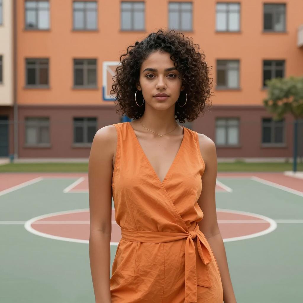 Portrait of a confident young woman with curly hair wearing an orange sleeveless wrap dress, standing on a multi-colored sports court with an orange building with multiple windows in the background. The setting suggests an urban outdoor area.