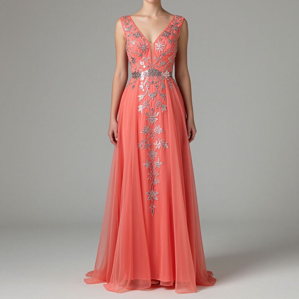 Elegant woman showcasing a 50s-inspired prom dress featuring a vibrant coral hue, embellished with intricate silver floral embroidery and a deep V-neckline, complemented by sheer, flowing layers cascading to the floor.