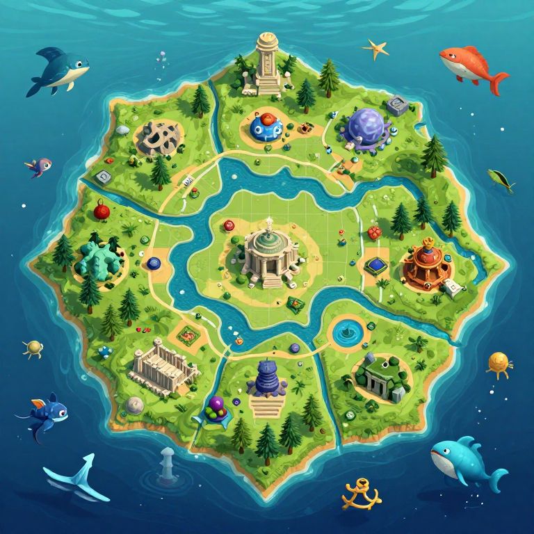 Island generator map presenting a stylized, colorful representation of an island surrounded by an ocean filled with mythical sea creatures, detailed landmarks such as ancient ruins and hidden treasure spots, and a grid overlay for strategic planning.