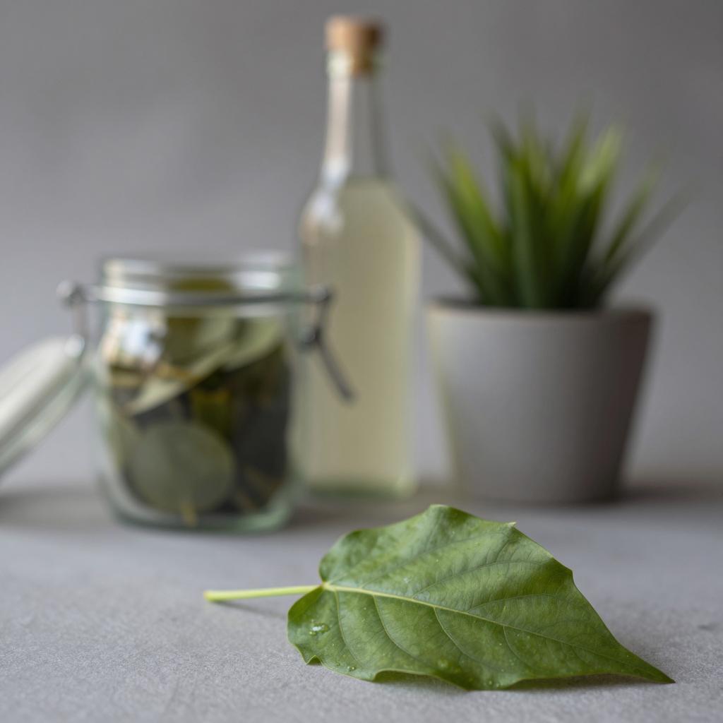 No humans, plant, still life, food focus, leaf, jar, food, blurry, potted plant, bottle, blurry background, depth of field, grey background, realistic