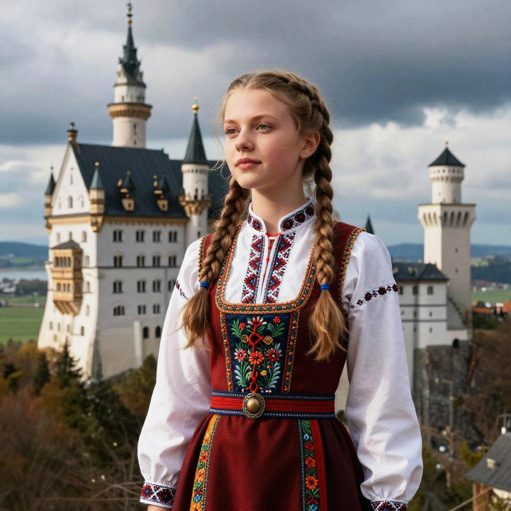 Cute German girl with braids, wearing a folk costume with intricate embroidery, standing in front of a historic German castle, dramatic sky, rich textures, cinematic style