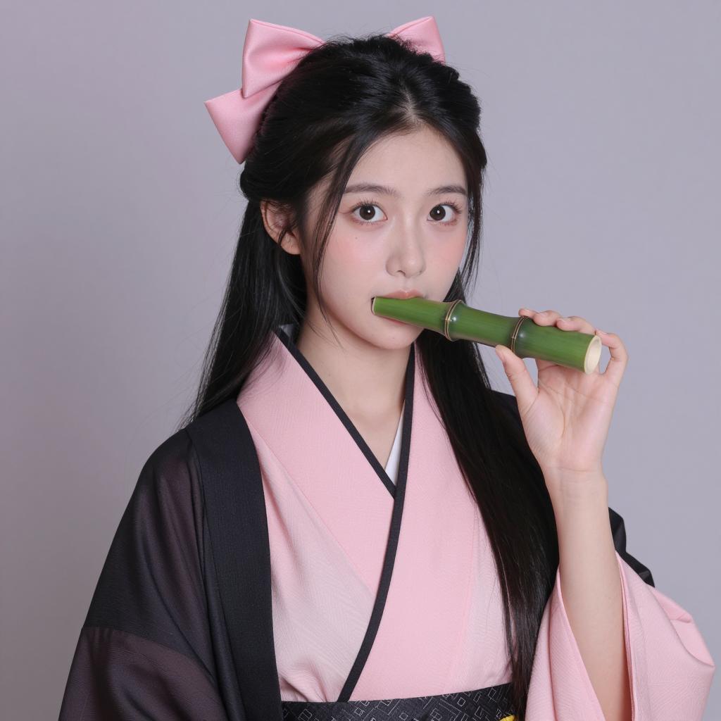 Photograph of a woman in a pink and black kimono with geometric patterns, long black hair with pink highlights, pink hair clip, green stick in her mouth. She holds her hand up, red nails, intense expression. Bamboo in the background. Nighttime setting.