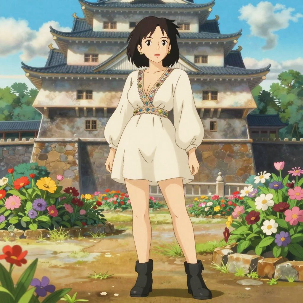 Illustration of a young woman in bohemian attire standing in a colorful flower field under a blue sky. She wears a white crochet crop top, a white maxi skirt with purple lace bands, and sandals. She accessorizes with a yellow flower crown, beaded necklace, bracelets, and earrings. The floral background features various blooming flowers with vibrant hues of pink, yellow, and white, rendered in an anime style inspired by Ai Yazawa.