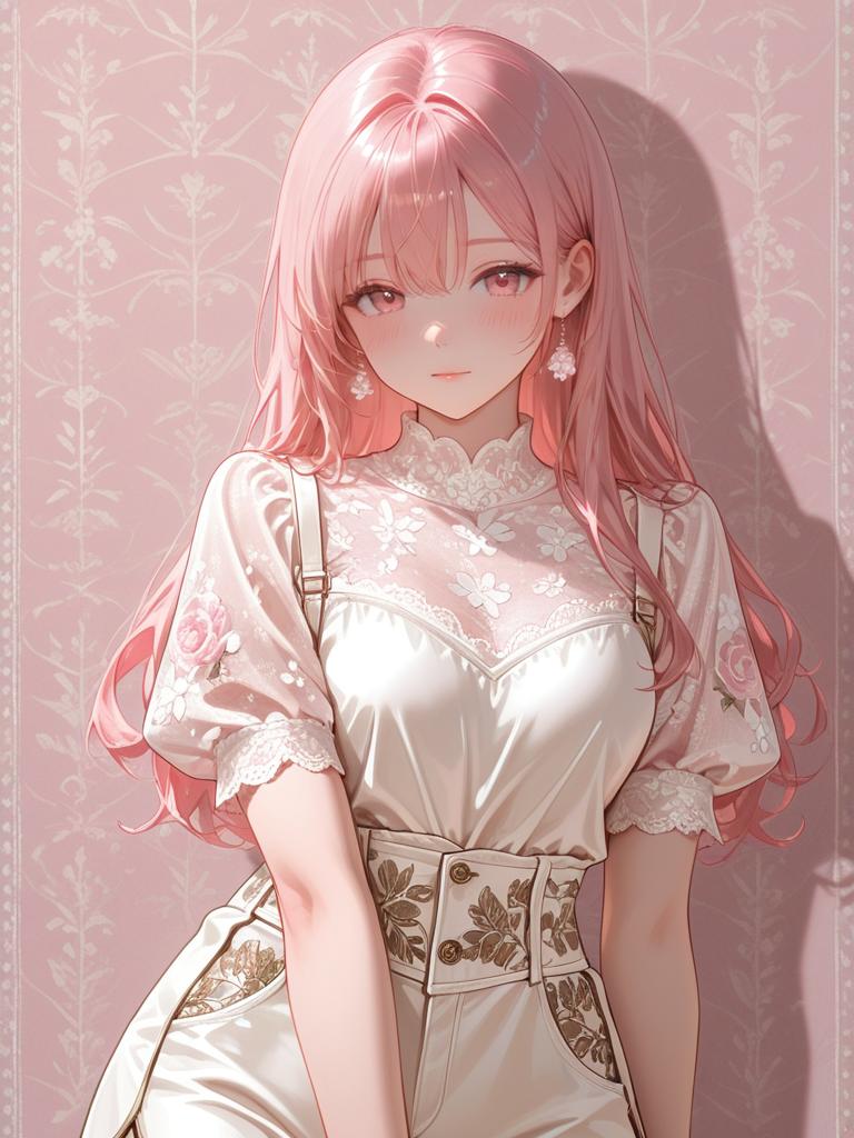 Portrait of an anime-style young woman with long pink hair wearing a delicate blush pink satin and lace top featuring floral embroidery and adjustable straps. She also wears matching high-waisted satin shorts with intricate floral embroidery, complemented by subtle makeup and floral earrings. The background is a soft pink patterned wallpaper that enhances the elegant and luxurious feel of the outfit.