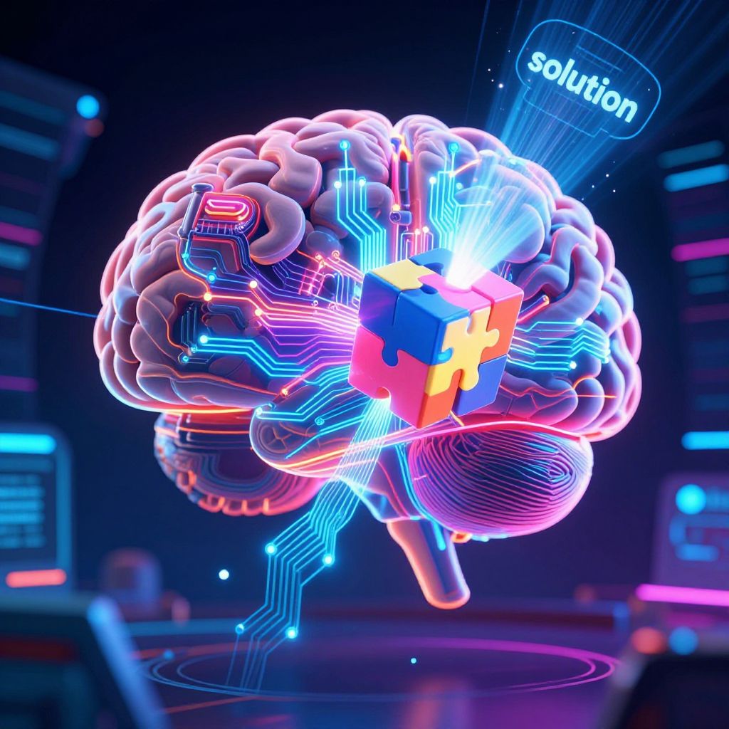 A dynamic scene of a human brain made of interconnected circuits and light flows, solving a puzzle cube emitting beams of light labeled 'solution', set in a cybernetic environment, vibrant neon colors, highly detailed and modern style