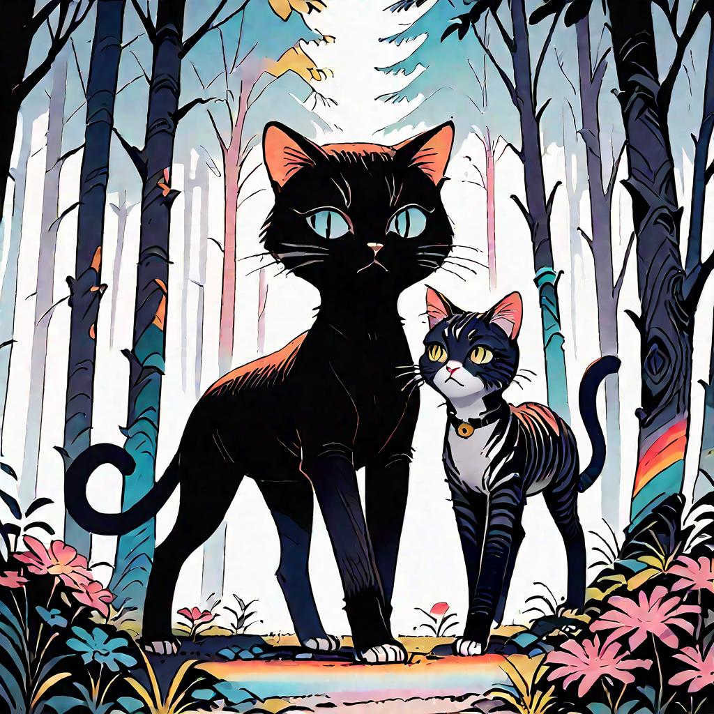 Score_9, score_8_up, score_7_up, source_ anime, 1girl, simple background, traditional art, cat, standing, forest, double rainbow