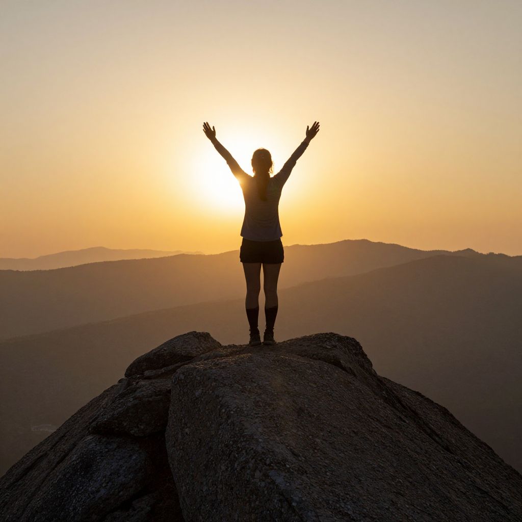 Woman standing triumphantly atop a rocky peak, arms raised high against the backdrop of a golden sunset and layered mountains, symbolizing achievement and freedom.