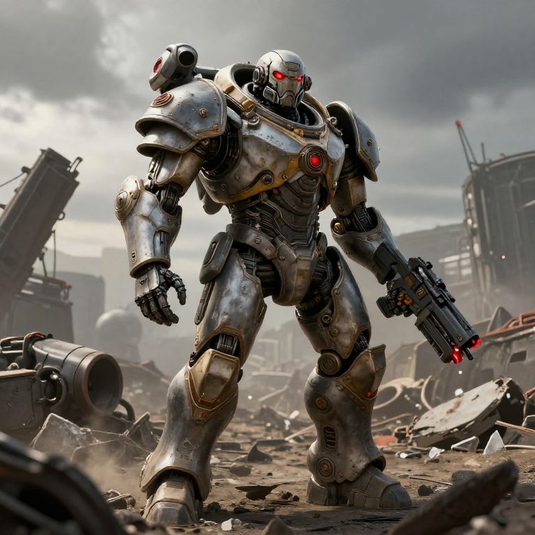 Mechanized warrior in a post-apocalyptic wasteland, clad in bulky armor with exposed mechanical joints, glowing red eyes, holding a large energy weapon, rugged terrain with broken machines and rubble, moody overcast sky, hyper-realistic with detailed textures