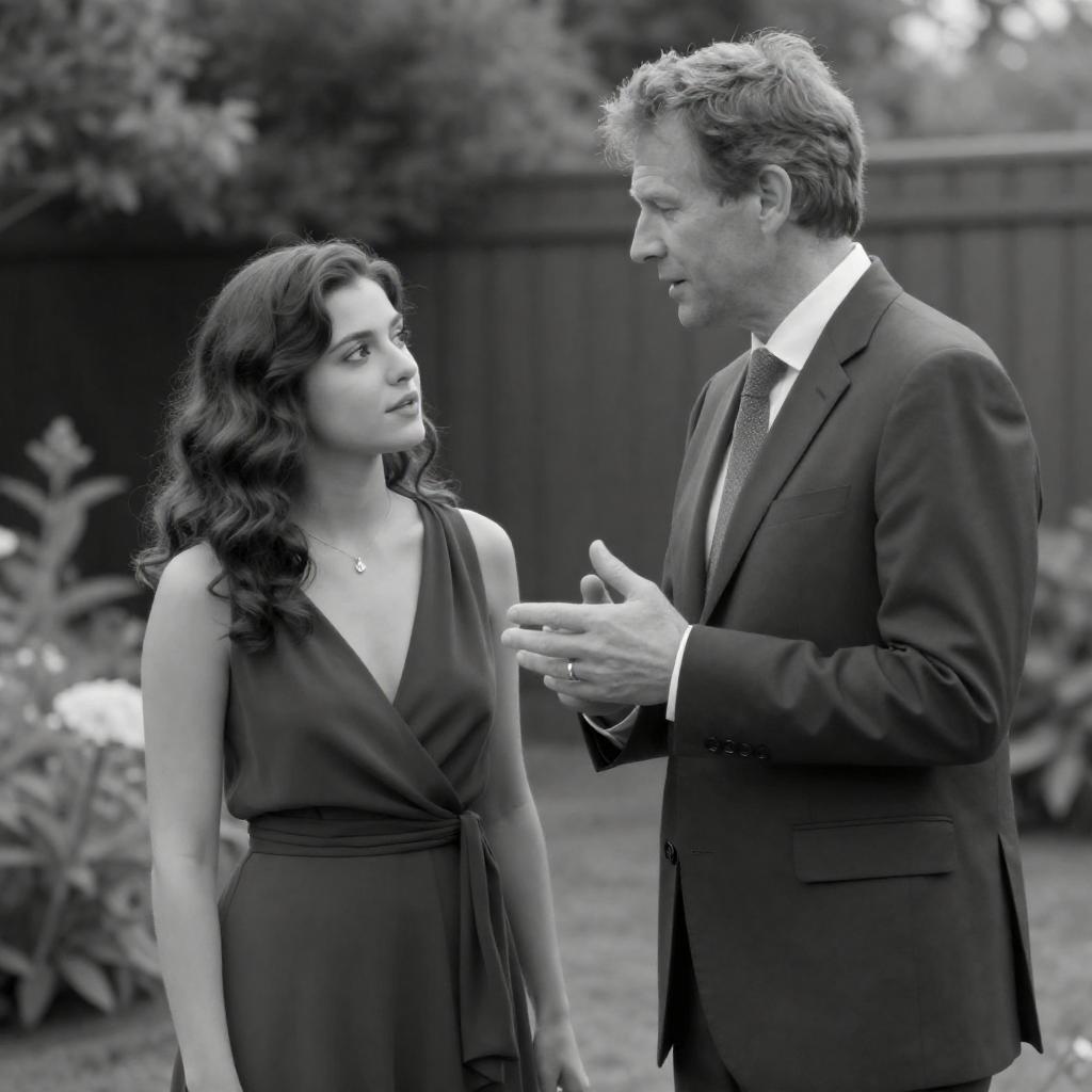 Black-and-white photograph of a middle-aged man with short, graying hair in a dark suit, holding a young woman with dark, wavy hair and wearing a light-colored coat. She looks over her shoulder with a slightly surprised expression, while he gazes forward. They stand close, with his arm around her shoulders. The background features draped fabric.