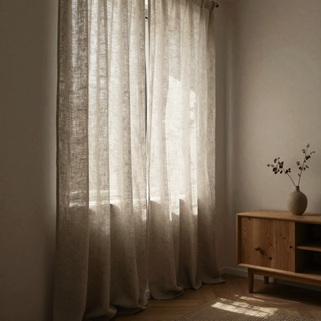 Neutrali mood portrayed through a cozy interior room scene with natural light filtering through linen curtains, featuring muted earth tones, wooden furniture, and minimalist decor that creates a serene and balanced atmosphere.