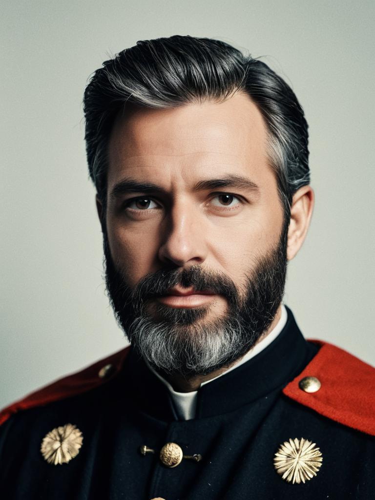 Close-up portrait of a man wearing a historical Grant military costume featuring red shoulder accents and decorative brass buttons. The man has a full salt-and-pepper beard and neatly styled dark hair, looking directly into the camera with a neutral expression. The background is plain, emphasizing the facial details and costume.