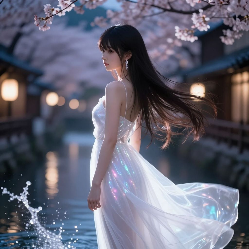 Photograph-like digital artwork of a young Asian woman with long black hair, wearing a glowing, translucent white dress that reflects iridescent colors. She stands in a serene, twilight canal surrounded by blooming cherry blossom trees. Her back is to the viewer, head turned to the side, revealing delicate features and dangling earrings. Soft light from lanterns illuminates the wooden buildings on either side. Water splashes around her, adding movement to the tranquil scene. The background is blurred, emphasizing her ethereal presence amidst the natural beauty. The overall mood is magical and serene.