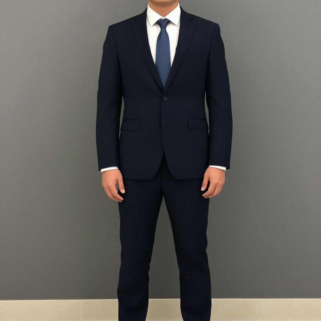 Photograph of a man standing against a plain, gray background. He is wearing a black, well-fitted suit with a white dress shirt and a black tie. The suit has a single button fastened at the chest and two flap pockets on the jacket. The man's face is not visible as the image is cropped just above his neck. His arms hang naturally by his sides, and he stands on a light-colored floor. The lighting is even, highlighting the formal attire and the smooth texture of the suit.