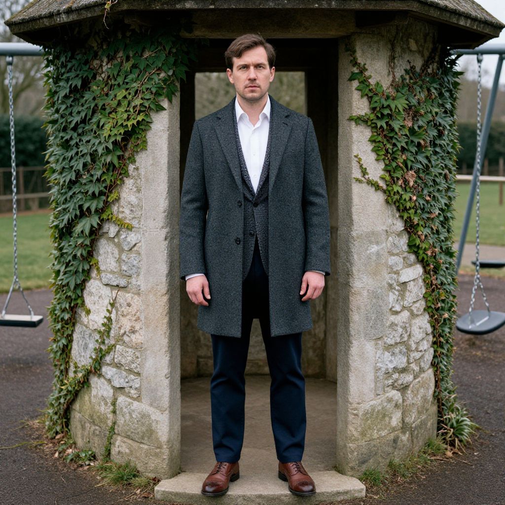 "a man, heritage wool overcoat in charcoal gray, tailored tweed blazer in houndstooth, crisp white dress shirt, dark navy chinos, brown leather brogues, standing in a quaint stone structure, ivy-covered walls, playground with swings, medium format film style, thoughtful expression. Man has masculine face and piercing eyes"