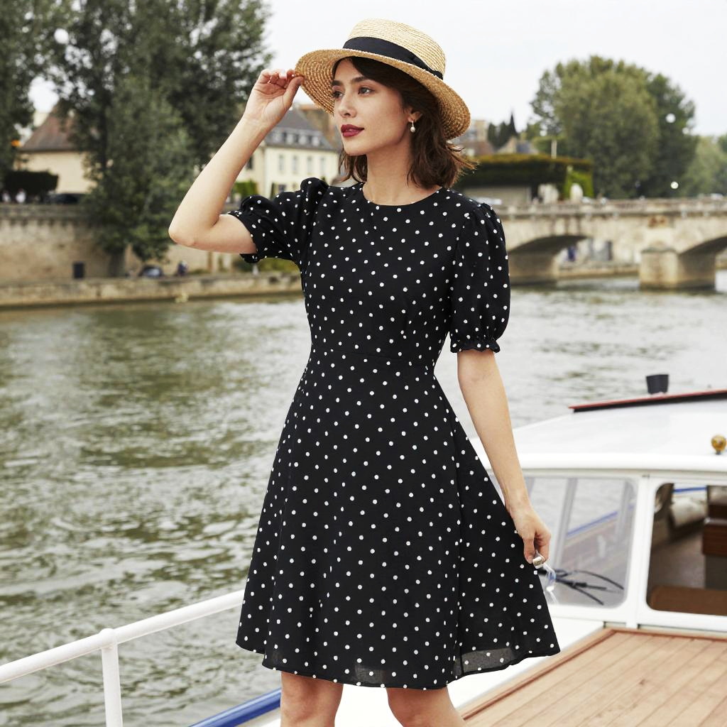 A Hourglass woman in a casual chic, short black A-line dress with white polka dots and puff sleeves, wearing a straw boater hat with a black ribbon, stands on a Riverboat on the Loire River in France, captured in the visual style of hakusensha. Sexy. Pretty face and beutiful eyes