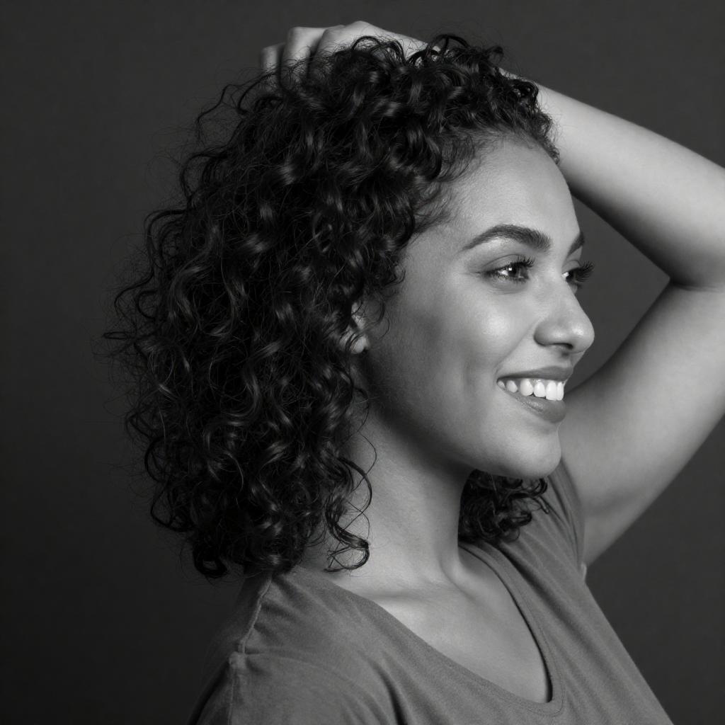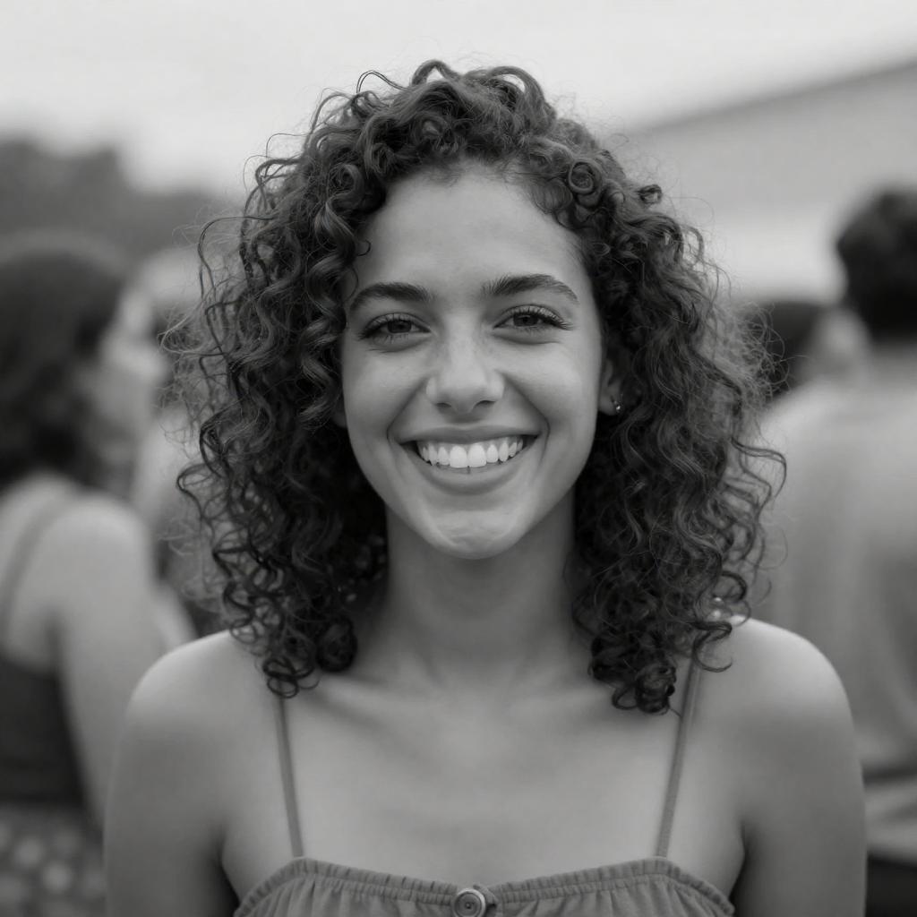 Black-and-white photograph of a smiling woman with curly hair, wearing a strap top, in the foreground. Blurred people in the background. Woman's face close-up, intense smile, visible upper body.