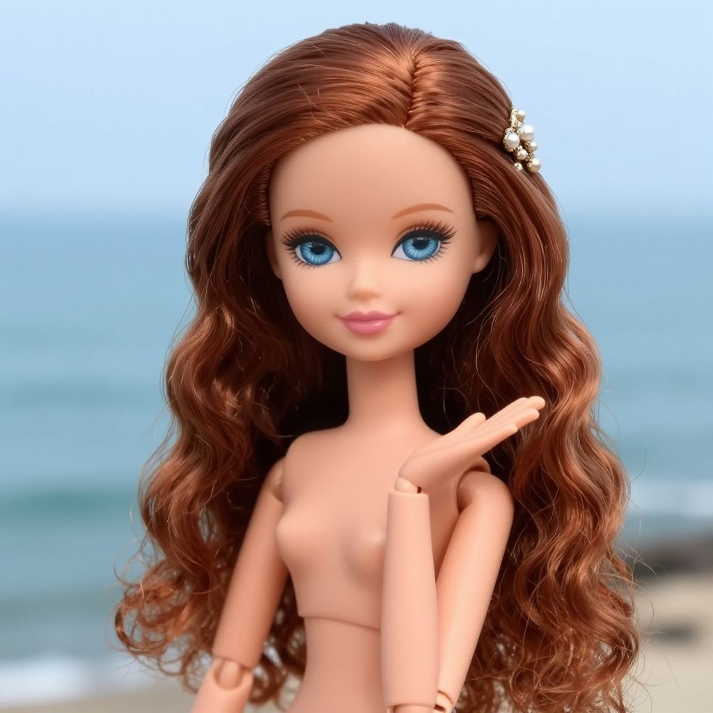 Photograph of a Barbie doll with long, wavy brown hair, blue eyes, and fair skin, standing on a beach with ocean background. She