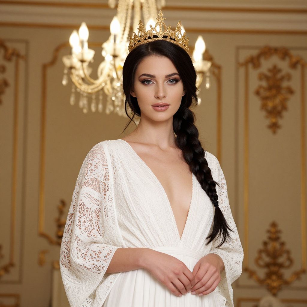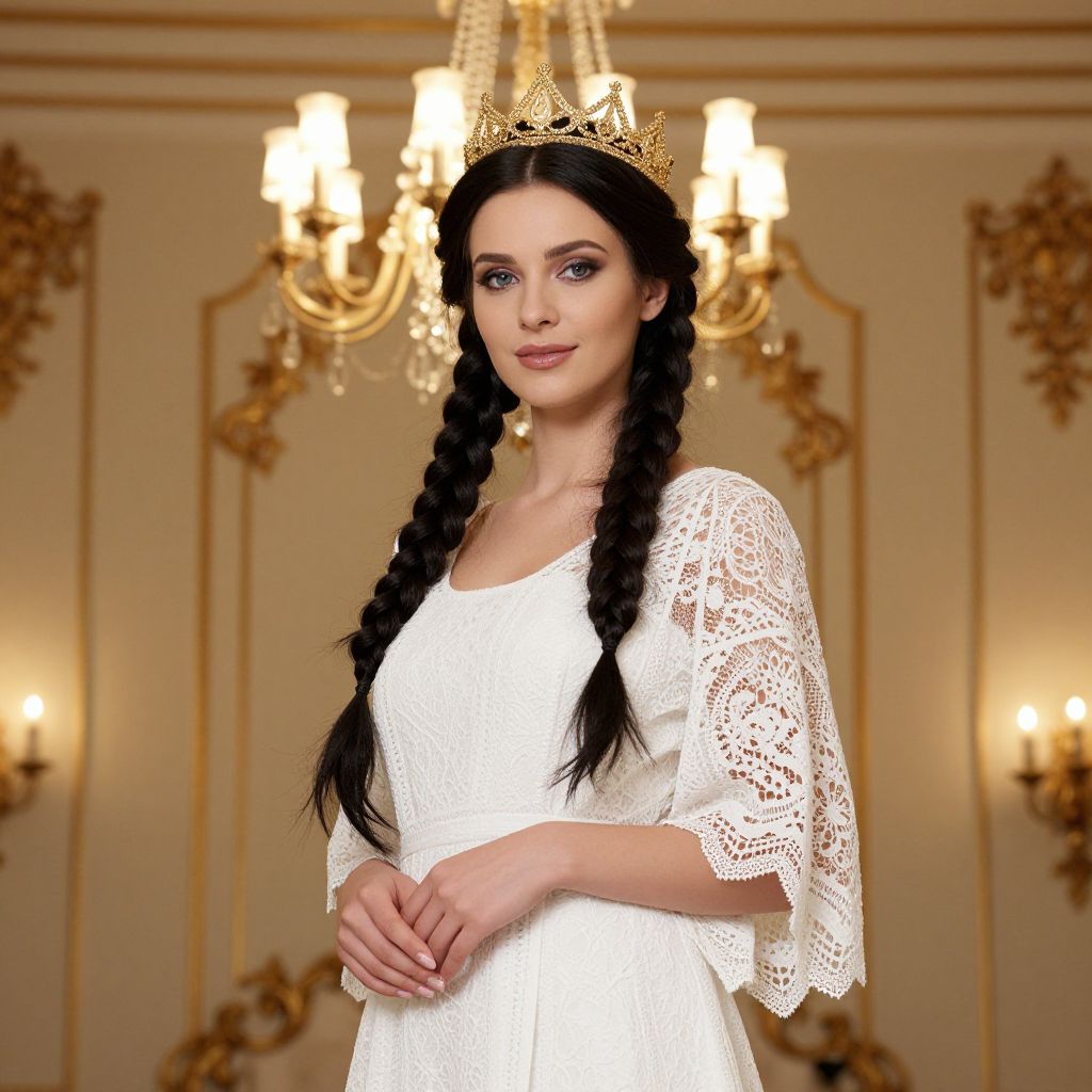 A photo of a fair-skinned woman with long, dark braids, wearing a gold crown and a white lace dress with loose sleeves. She has blue eyes, light makeup, and a subtle smile. A glowing chandelier hangs in the background, illuminating an elegant, beige room with ornate gold detailing. She's standing with her hands gently clasped in front of her.