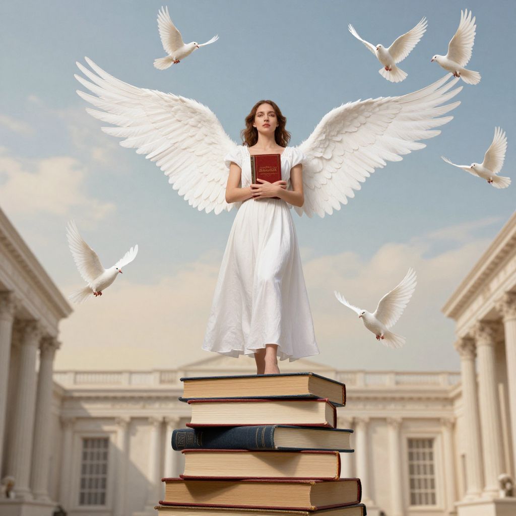 A woman with expansive feathered wings stands atop a stack of large books, holding a red-bound tome, as a flock of white doves flutters around her against a backdrop of classical architecture and a serene sky.