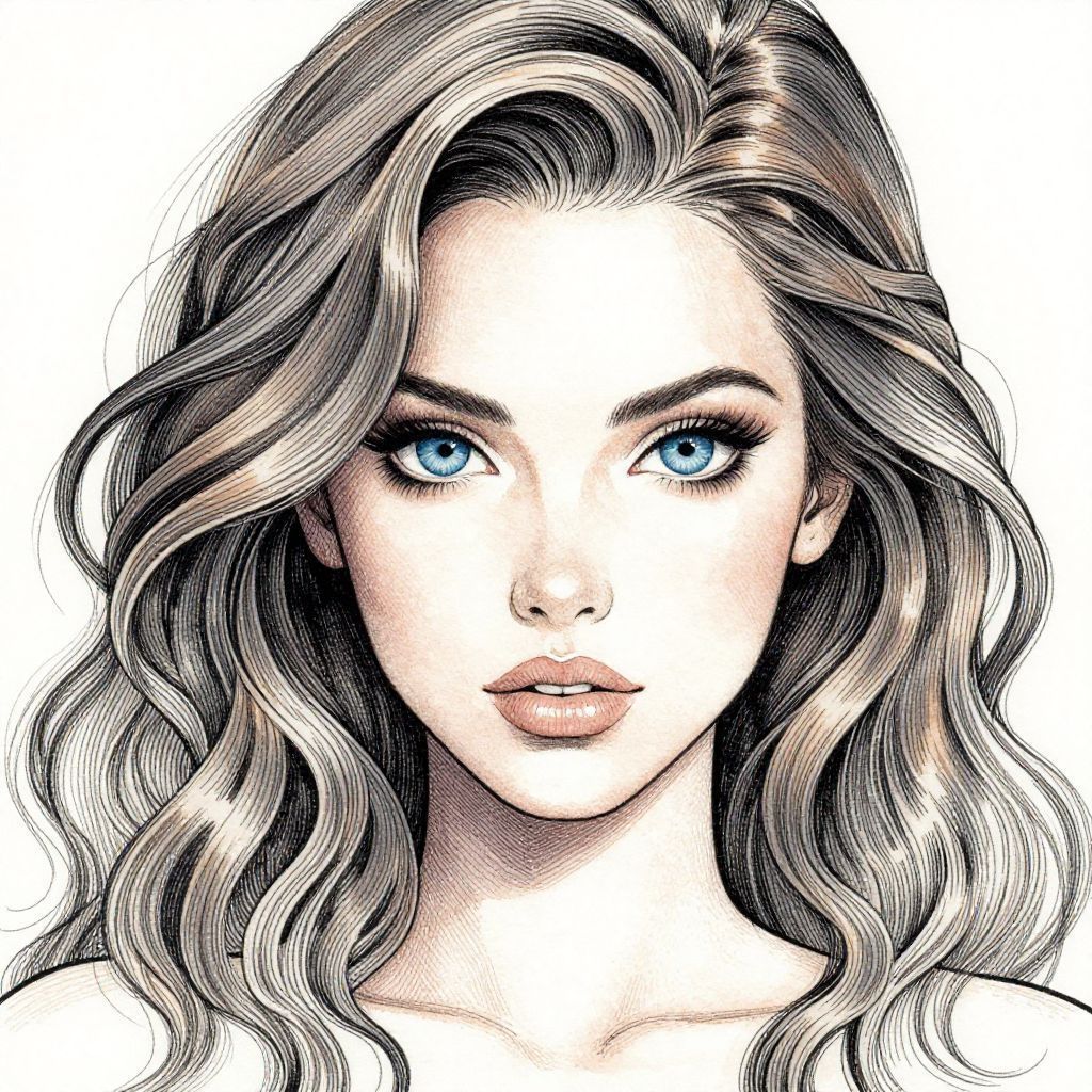 This captivating illustration showcases a powerful woman with striking blue eyes and flowing, wavy hair. The artistic style is a blend of watercolor techniques and detailed line work, creating a dynamic and enchanting portrait.