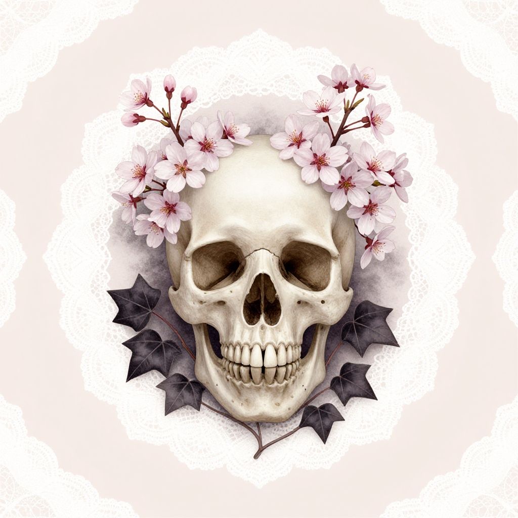 Goth spring wallpaper with an elegant skull adorned by blooming cherry blossoms and dark ivy, surrounded by delicate lace patterns and soft pastel backgrounds, creating a blend of haunting gothic beauty and fresh spring themes in detailed digital art style.