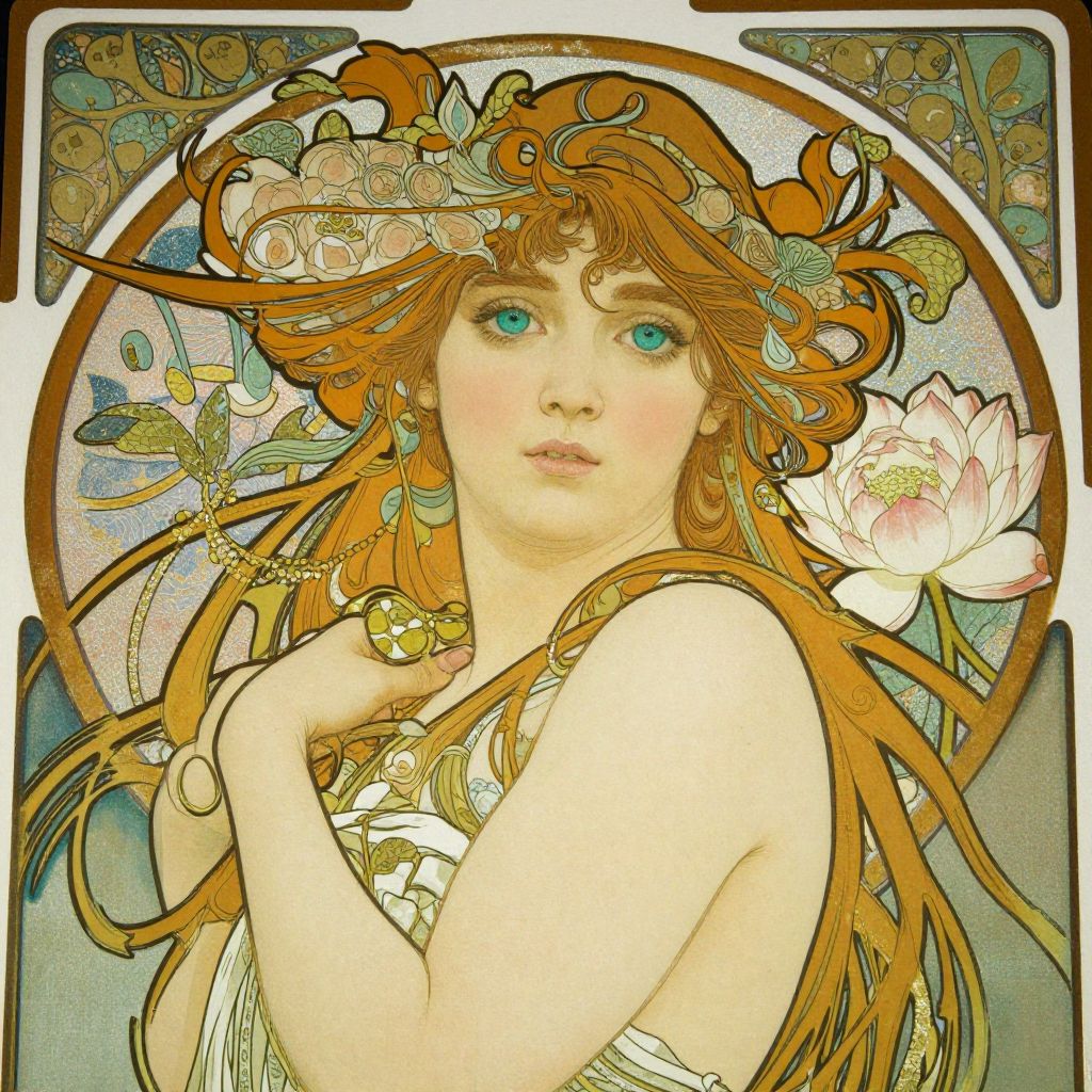 Art Nouveau-style digital painting of a fair-skinned woman with vibrant orange hair, blue eyes, wearing a floral headpiece, holding a golden bead