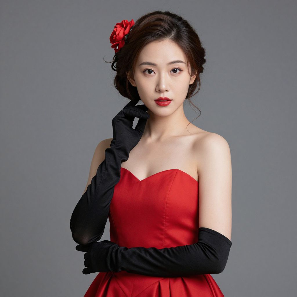 Photograph of an Asian woman with fair skin and black hair styled in an updo adorned with a red flower. She wears a strapless, bright red dress and long, black satin gloves that extend past her elbows. Her makeup includes bold red lipstick, and she gazes directly at the camera with a calm expression. The background is a plain, solid gray, highlighting her vibrant outfit. The lighting is even, creating a soft, studio-like effect. The overall style is elegant and vintage-inspired.