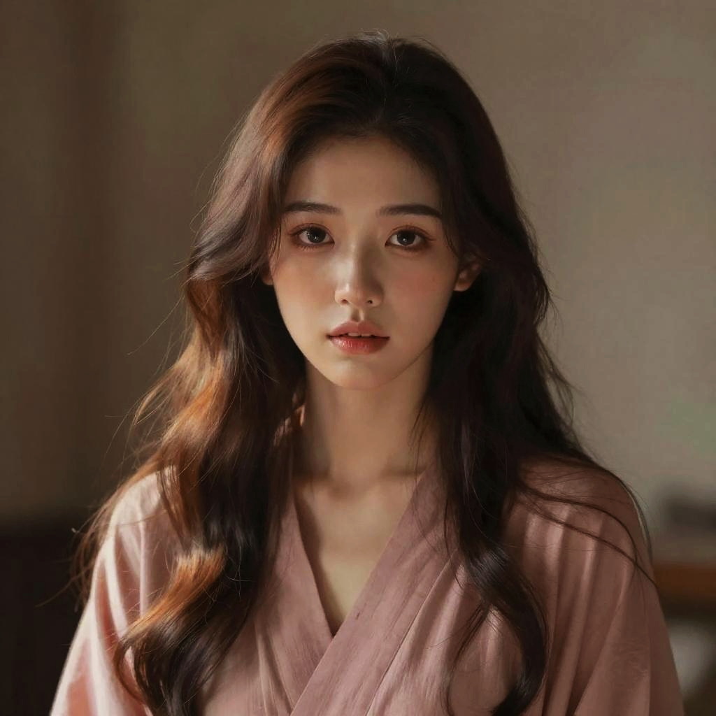 Soft anime‑style digital painting of a beautiful young woman in her early thirties with long flowing chocolate brown with copper highlights hair and expressive eyes, wearing a draped dusty rose garment, gently illuminated by diffused light in a muted, enclosed setting, her gaze direct and emotional, detailed facial features and soft textures with pastel highlights, conveying a mood of quiet vulnerability and intimacy