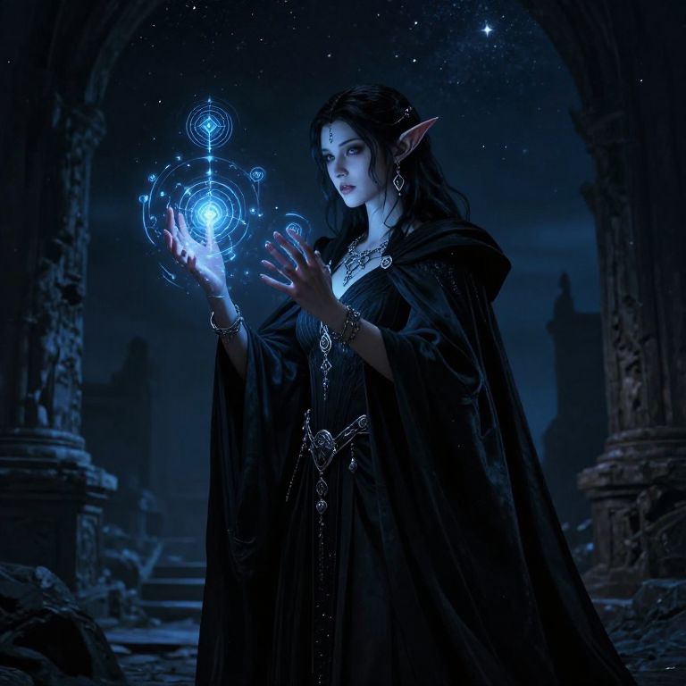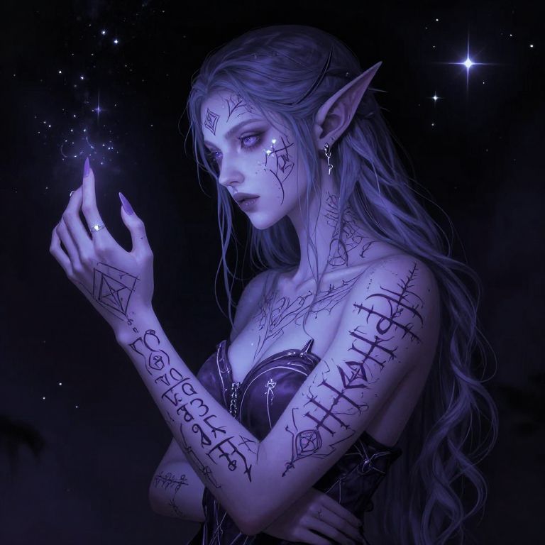 Drow tattoos glowing softly on pale violet skin, elven script and mystical symbols, dark elf mage casting spells, starry night backdrop, high contrast, fantasy art