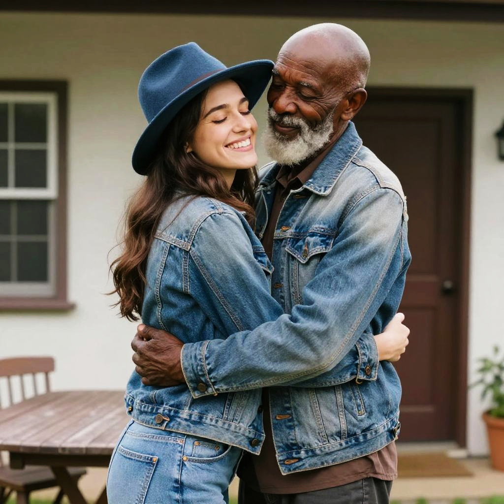 Photograph of an interracial couple embracing outdoors. The woman, with long dark hair and fair skin, wears a blue denim jacket and matching wide-brimmed hat, smiling with eyes closed. The bald, older man with dark skin and a white beard, also in a blue denim jacket, has his eyes open and a warm smile. They stand in front of a white house with a brown door and window, a wooden table, and chair in the background. The couple's arms are around each other, creating a sense of affection and connection. The image has a vibrant, slightly saturated color style.