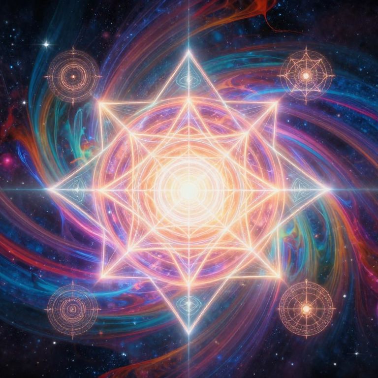 Digital art of a glowing, multi-layered star with intricate geometric patterns against a swirling, colorful cosmic background filled with stars.