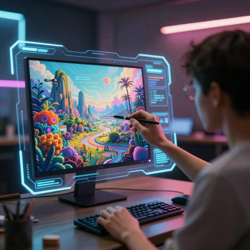Online AI image generation concept showing a user interacting with a holographic interface, AI algorithms painting surreal landscapes, neon lights, cyberpunk style, vivid textures.