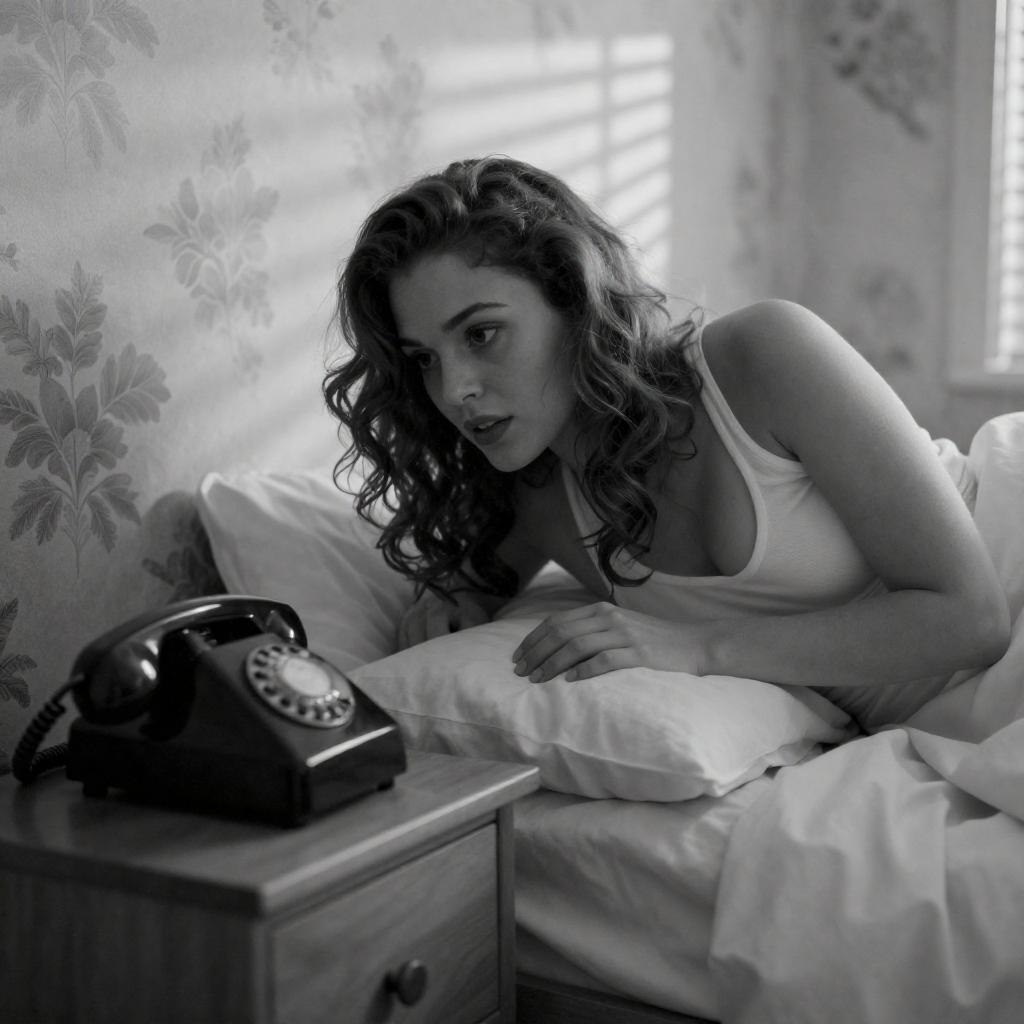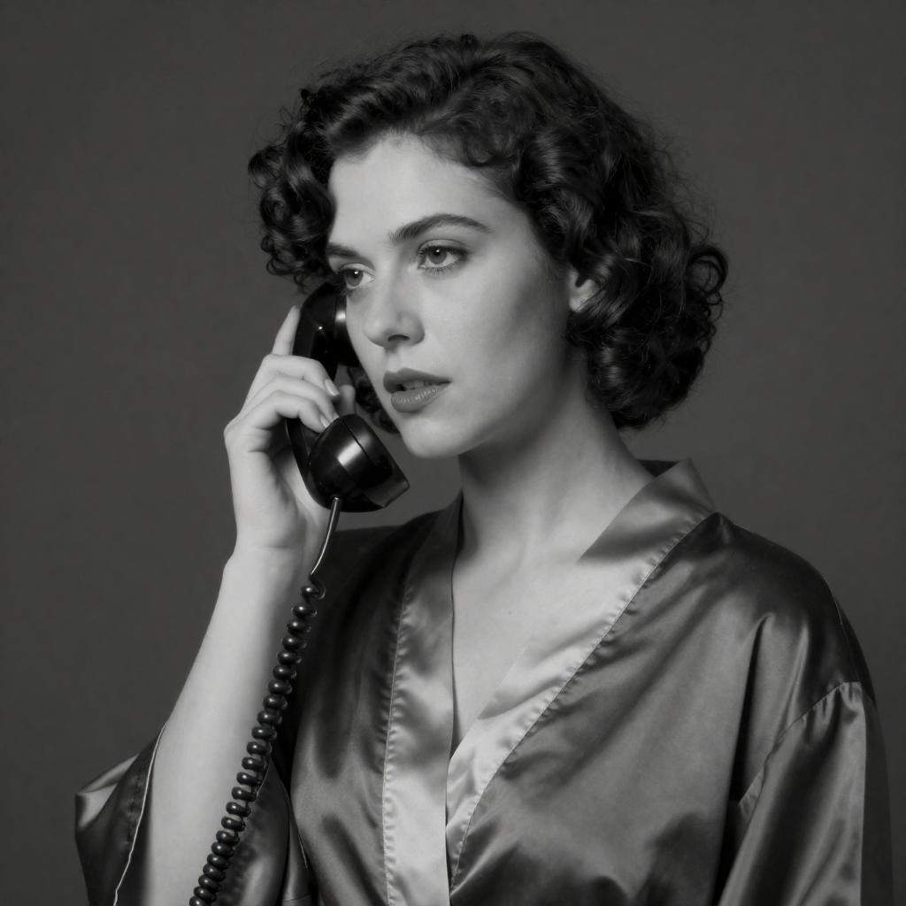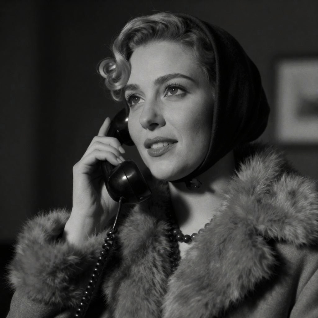 Black-and-white photograph of a woman with curled blonde hair, wearing a dark headscarf, fur-trimmed coat, and beaded necklace, holding a vintage telephone to her ear. She has a slight smile and looks upward. Telephone on the left. Background is dark and blurred.