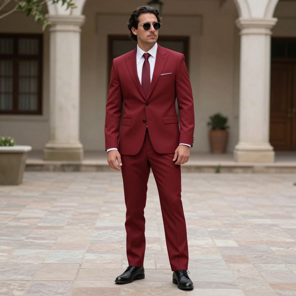 Photograph of a handsome man with dark hair and sunglasses, wearing a maroon suit, white shirt, red tie, and black shoes, standing in