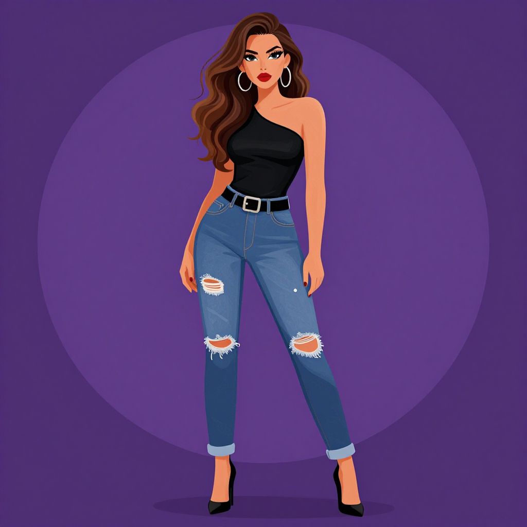 Digital illustration of a confident woman with long, wavy brown hair and fair skin, standing against a solid purple background with a darker purple circle behind her. She wears a black, one-shoulder top, blue ripped jeans with white frayed patches, and black high-heeled shoes. Her large hoop earrings and bold red lipstick add flair. She has a slender build and stands with one hand on her hip, exuding a stylish and fashionable appearance. The artwork uses bright, contrasting colors and clean lines, emphasizing her trendy outfit and confident pose.