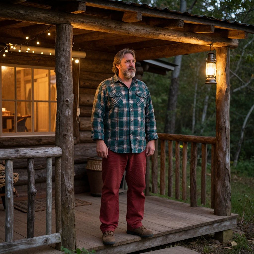 Photograph of a middle-aged man with a beard, standing on a wooden porch of a rustic log cabin at dusk. He wears a green and blue plaid shirt, red pants, and brown boots. The porch is lit by a hanging lantern, casting a warm glow. Behind him, string lights illuminate the interior, visible through large windows. The cabin is surrounded by dense forest. The man has a neutral expression and stands with his hands by his sides. The wooden porch and log cabin have a weathered texture, adding to the rustic atmosphere.