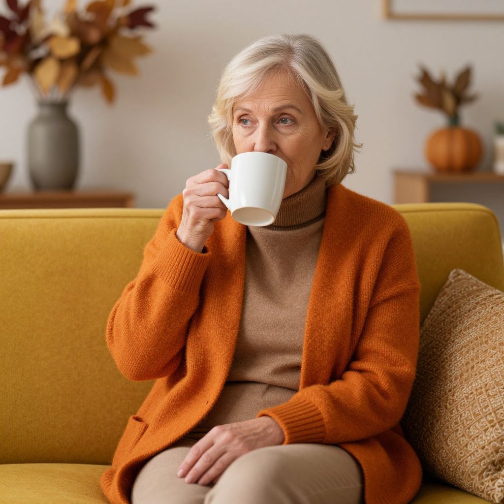Senior woman sipping from a white ceramic mug while comfortably seated on a mustard-yellow couch, layered in a cozy orange cardigan over a brown turtleneck sweater, surrounded by warm autumnal tones in her living room.