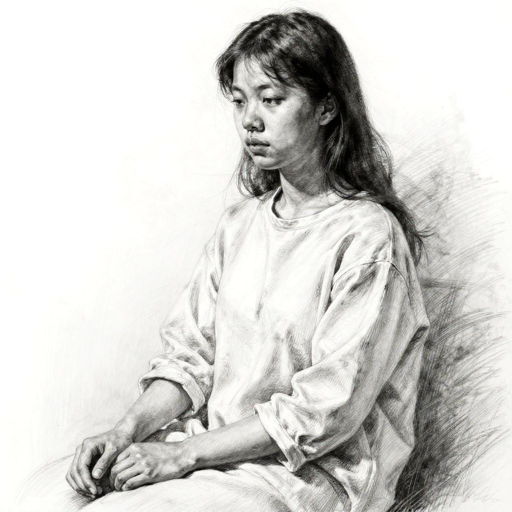 Realistic pencil drawing of girl, seated pose with relaxed expression, intricate pencil strokes showing fabric folds and hair strands, emphasizing light and shadow balance on the face and hands, artistic focus on realism and emotional depth, black and white sketch.