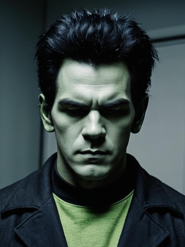 Frankenstein adult costume, 1boy, male focus, solo, black hair, upper body, looking at viewer