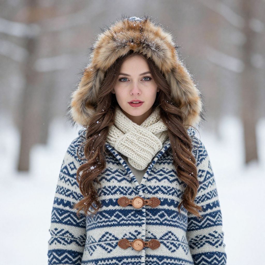 Portrait of a young woman wearing a fur-trimmed hooded coat and a knitted scarf. She is standing in a snowy forest with snow gently falling around her. The coat has a blue and white intricate pattern with large wooden buttons, and she has long brown hair styled in loose waves.