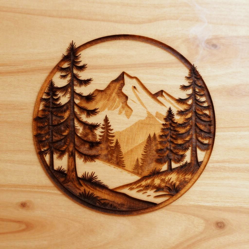 Rustic pyrography logo of a forest emblem, detailed tree silhouettes and mountain outlines burned into smooth wood, warm golden hues with smoke effects lightly blending into background, artistic and nature-inspired design.