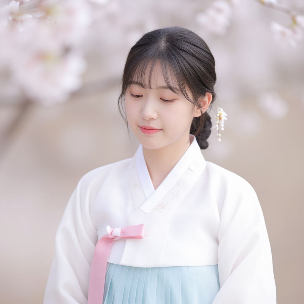Shy in Korean style, a young woman blushing softly, traditional hanbok dress, delicate cherry blossoms around, subtle hesitant smile, pastel colors, serene atmosphere