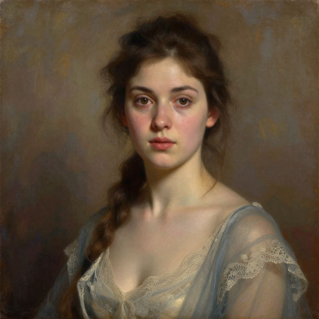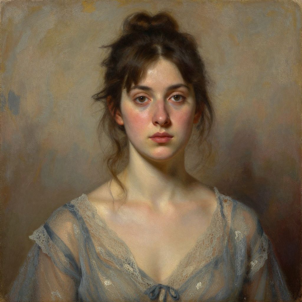 A digitally rendered figurative portrait in a realistic style, reminiscent of Paul Hedley's British figurative painting techniques, featuring a woman in a delicate lace-trimmed garment against a textured, vintage-inspired backdrop with dramatic lighting effects.