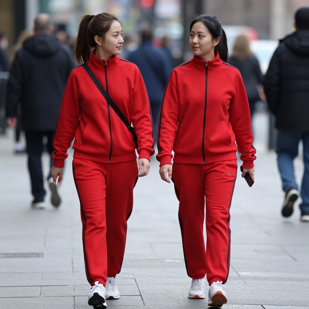 Two individuals walk hand-in-hand down a city street, both dressed in vibrant cherry red tracksuits featuring black stripes, with the woman carrying a red-and-white object in her free hand.