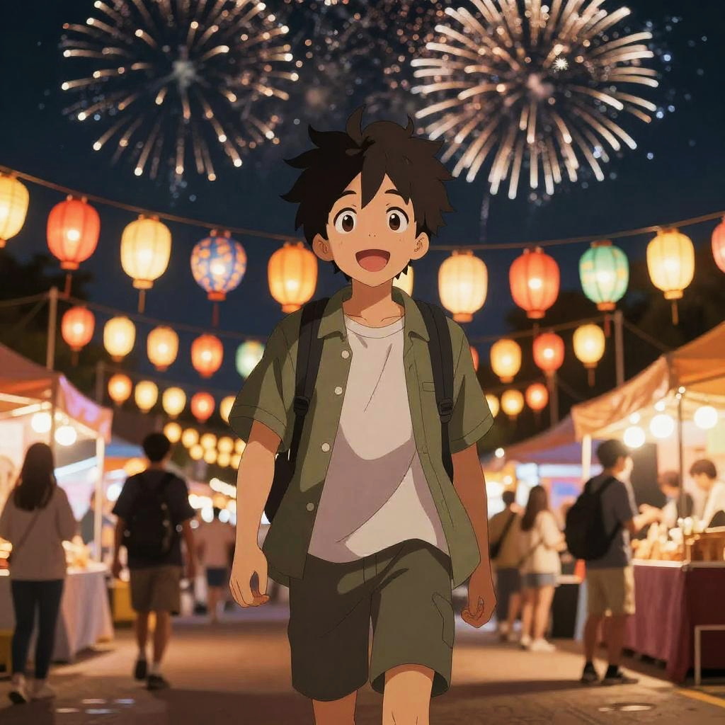 Anime-style digital drawing of a nighttime festival with colorful lanterns, fireworks, and people in casual clothes enjoying food from stalls.