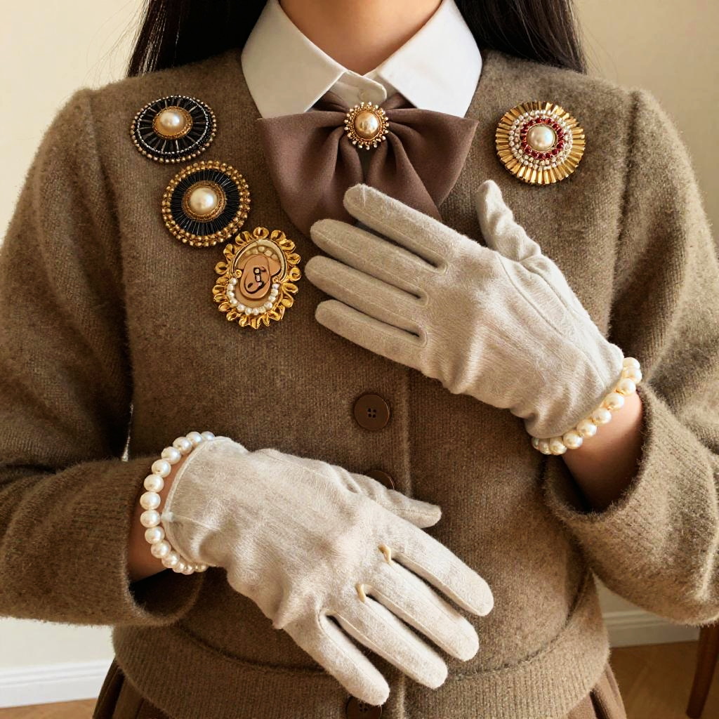 Accessorization of a vintage-inspired outfit with eclectic mix of brooches, gloves, and pearls, warm tones, soft natural light, whimsical atmosphere, intricate fabric textures
