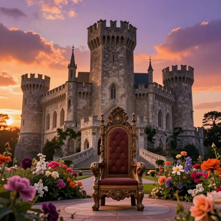 A grand castleandchair scene at sunset, towering gothic castle with battlements, a regal ornately carved throne chair placed in the courtyard, surrounded by vibrant blooming flowers, warm orange and purple sky, dramatic and majestic fantasy art style.