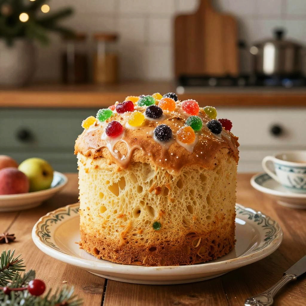 Panettone in a rustic Italian kitchen setting, surrounded by holiday decorations and warm soft lighting, highlighting the fluffy texture and colorful candied fruits on top, styled with vintage ceramic plates and a cozy atmosphere.