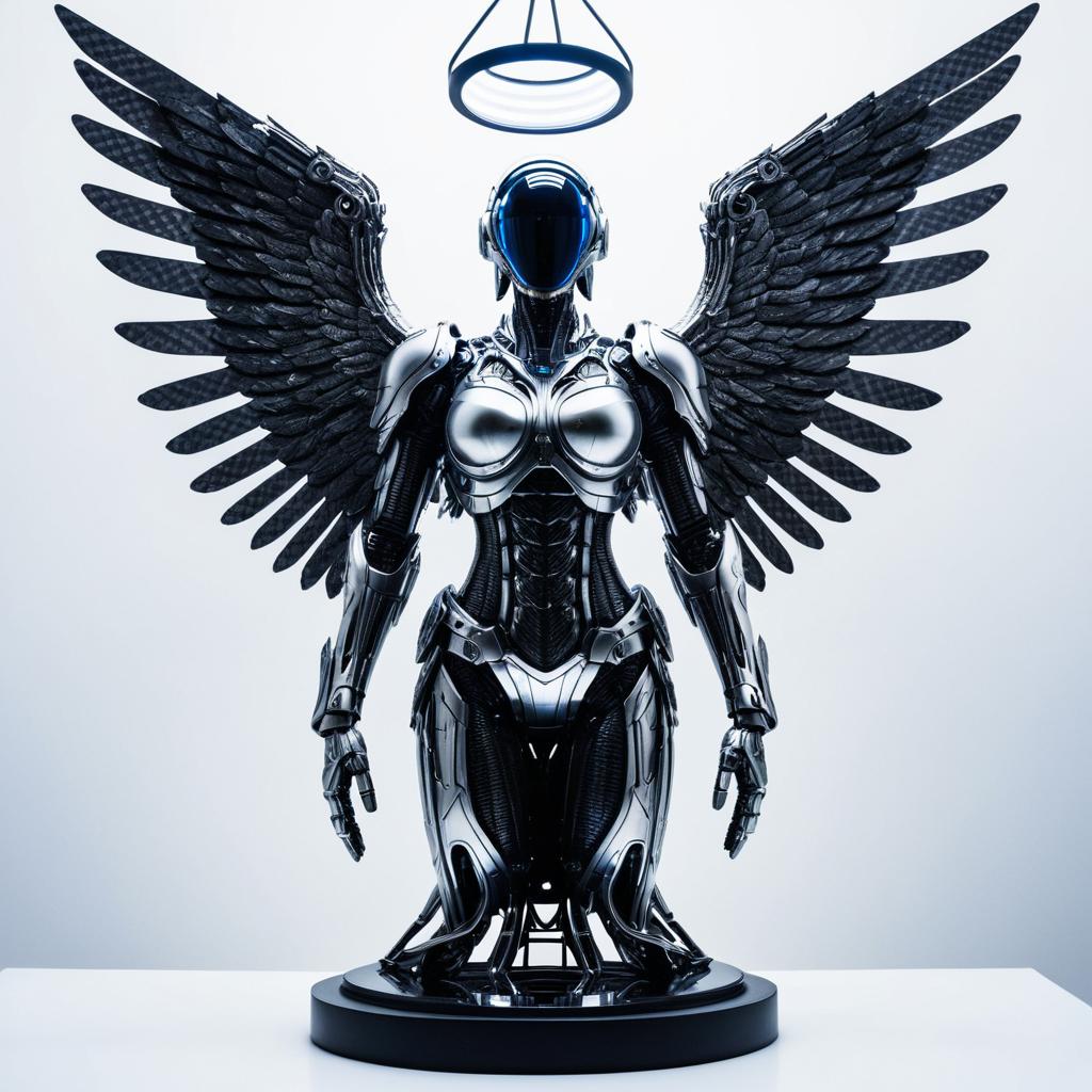 A cyberpunk samurai android warrior crafted from chrome, carbon fiber, sapphire glass, and neon lights, designed by Yoshitaka Amano and Syd Mead, with intricate linework, hyper-detailed textures, vibrant colors, super sharp focus, high contrast, and a matte finish.