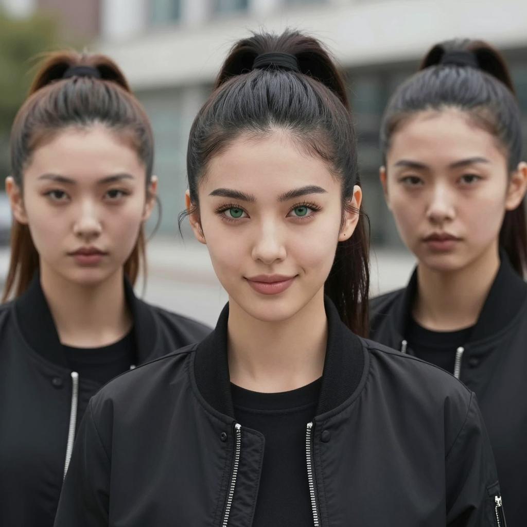 Three women with dark hair in high ponytails, wearing black jackets. Central woman with green eyes, defined eyebrows, and slight smile. Left woman with light brown hair, intense gaze. Right woman with dark brown hair, neutral expression. Blurred urban background.